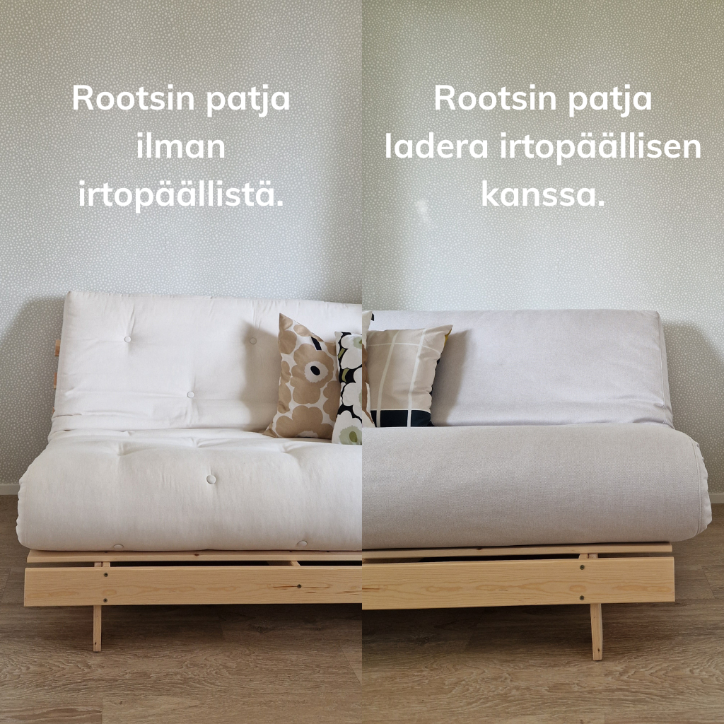 Kuvasarjassa Roots vuodesohvan patjan päälle puetaan Iadera Terra irtopäällinen.