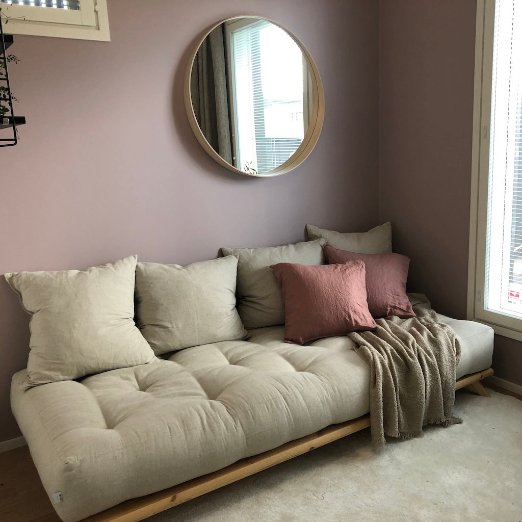 Massiivipuinen runko on luonnonväriseksi lakattu. Futonpatjan ja tyynyjen kankaissa on paljon hyviä värejä valittavana. Kangasvaihtoehtojen tekniset tiedot ja kuvat isompana voi katsoa täällä. Tutustu vaihtoehtoihin ja valitse oma kokonaisuutesi.
